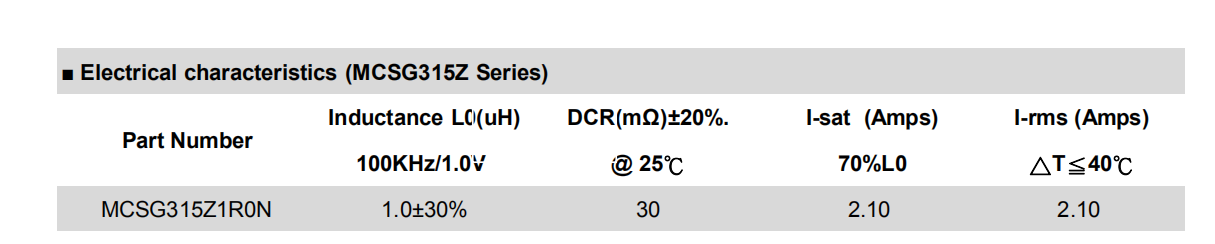 MCSG315Z1R0N貼片電感電氣參數:
